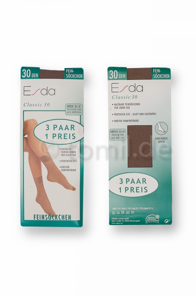etwas breiterem & weichem Rand und verstärkter Spitze von der Marke Esda bieten wir in 30 den, die stabileren, an. Dank des breiteren Randes schneiden diese Feinsöckchen nicht so ein. Die Feinsöckchen in 30 den sind matt und haben keinen Glanz und