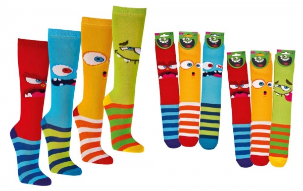 Diese weichen & gekettelten Baumwollkniestrümpfe für die Kinder mit dem Motiv vom lustigen Monstern bieten wir im 3er Pack an. Dank des Materials Baumwolle mit Elasthan und der echten Ferse sitzt alles perfekt am Fuß. Schadstoffgeprüftes material nach Oeko Tex Standard 100, Markenqualität von Socks4fun, Diese Socken sind OHNE Naht (gekettelt) - vorne glatt gestrickt, so kann auch im Zehenbereich nichts Drücken.