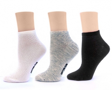 Mit echter Ferse und durch den Einsatz von Elasthan geben diese Sneakersocken auch gut nach. Die Schuhgrößeist unterhalb der Sohle mit eingestrickt.