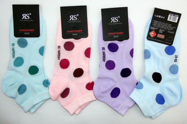 Diese weichen Baumwoll Kurzschaft Socken von RS Harmony mit großen Punkten in Pastellfarben bieten wir im 3er Pack an. Bei diesen Socken ist der Schaft etwas höher als bei Sneakersocken und kann daher nicht in den Schuh reinrutschen. die Schafthöhe bei diesen Socken beträgt ca. 8cm. Durch die echte Ferse und dem Materialmix von Baumwolle/Elasthan sitzen die Socken perfekt am Fuß. Ohne Naht (gekettelt), daher können die Socken im Zehenbreich nicht drücken! Textiles Vertrauen, schadstoffgeprüftes Material nach oeko tex standard 100, mit verstärkter Ferse und Spitze. Qualität von RS Riese Strümpfe, die Schuhgröße und RS harmony ist unter der Sohle mit eingestrickt. mit normalem Abschlußrand (kein Softrand)
