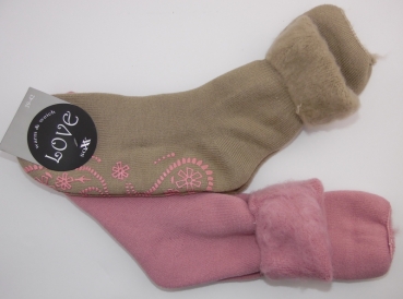 Diese warmen und flauschigen Thermosocken mit Innenfell! bieten wir im 2er Pack an, 1 Paar ist mit ABS Noppen und das andere Paar ohne. Mit Umschlagrand hergestellt, so kann diese Thermosocke als Langsocke mit ca. 20cm Schafthöhe oder als Umschlagsocke mit ca. 15cm Schafthöhe getragen werden. Durch das weiche Innenfell halten diese Socken super warm! Mit Softrand, hier ist der Rand nicht so eng! rutschat aber auch nicht. mit echter Ferse hergestellt.